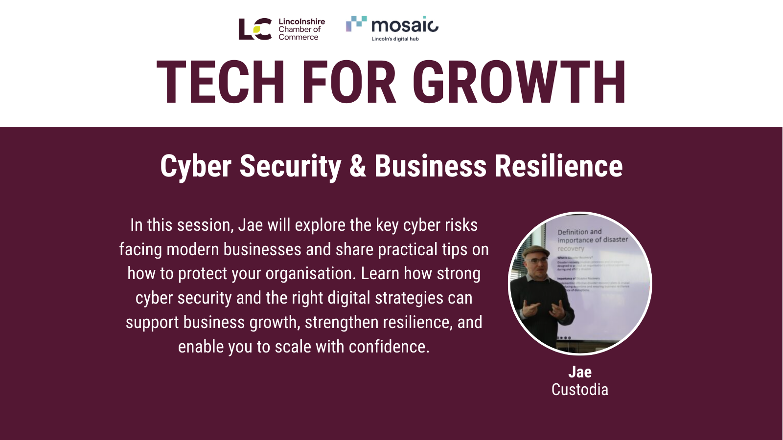 Join us for an insightful session on Cyber Security & Business Resilience with Jae from Custodia.